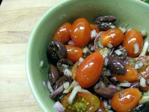 - Combine tomatoes, kalamatas, red onion, and garlic in a bowl. Toss together with 2 tbs olive oil, balsamic, lemon juice, and dried spices.