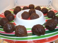After Part II of the recipe: truffles rolled and in the refrigerator to cool. Ignore the tacky holiday plate; we are currently staying at a furnished house that lacks some sophisticated plate ware.