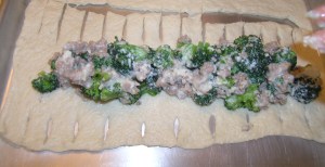 There was a memorable day in culinary school when my pastry teacher was out sick, and our substitute was a teacher from the culinary (savory) teaching program. He taught us a number of fun ways to use basic pastry ingredients in savory dishes. My favorite was using puff pastry for making homemade calzones. The dough is braided to enclose the filling and looks beautiful. Almost every week our teacher would send us home with tons of extra puff pastry, and I would try and drive the not-so-quick six hours down to see Ryan in Virginia without it melting. I’d make a few batches of calzones, freeze them, and he’d have dinners for when I wasn’t around! He became a favorite among his roommates when he was nice enough to share.