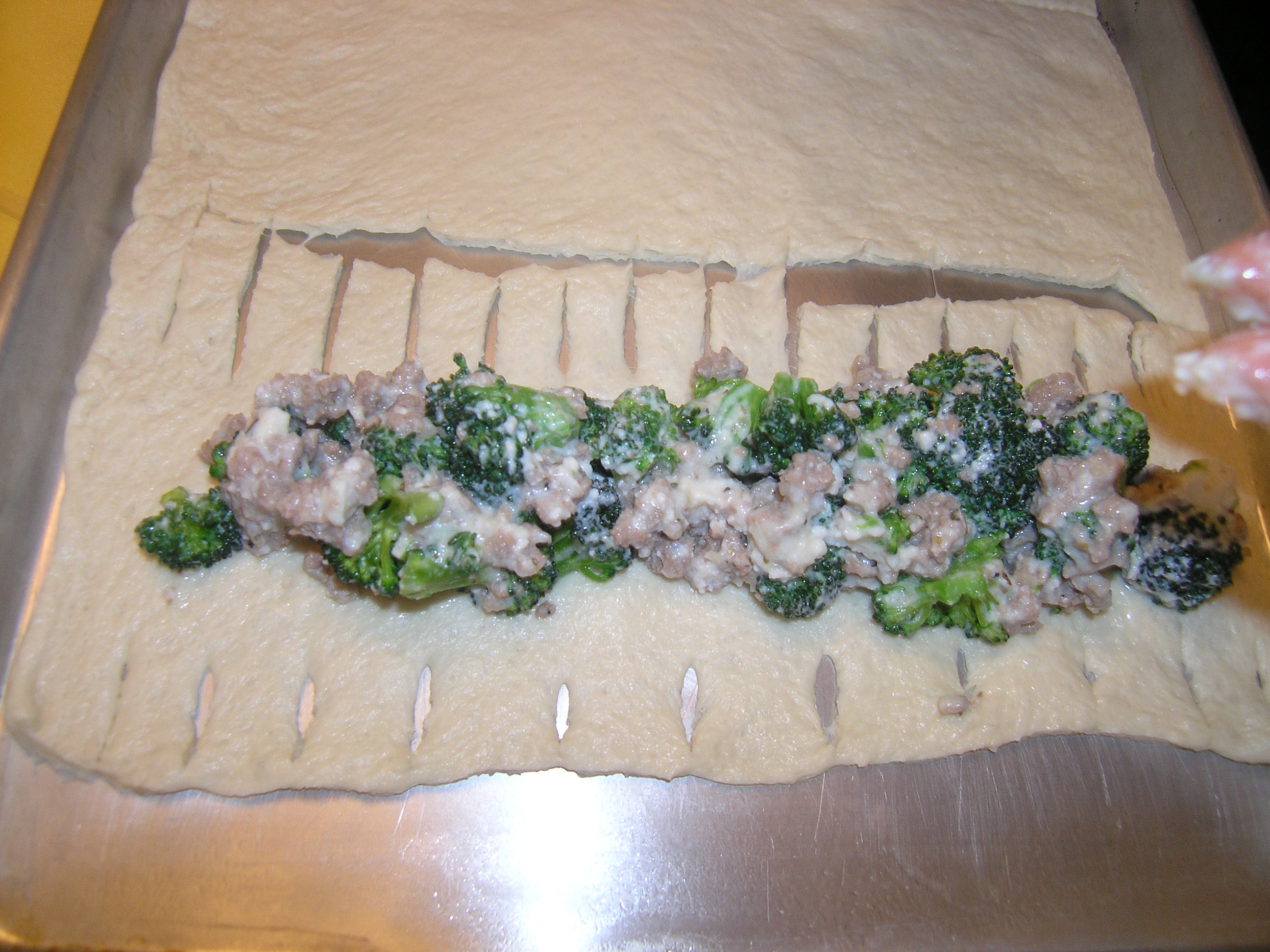 - Trim the broccoli of all its stems. Cut the broccoli florets down to very small pieces, about the size of your finger nail. This helps incorporate everything into the filling and allows the calzones to be braided easily.