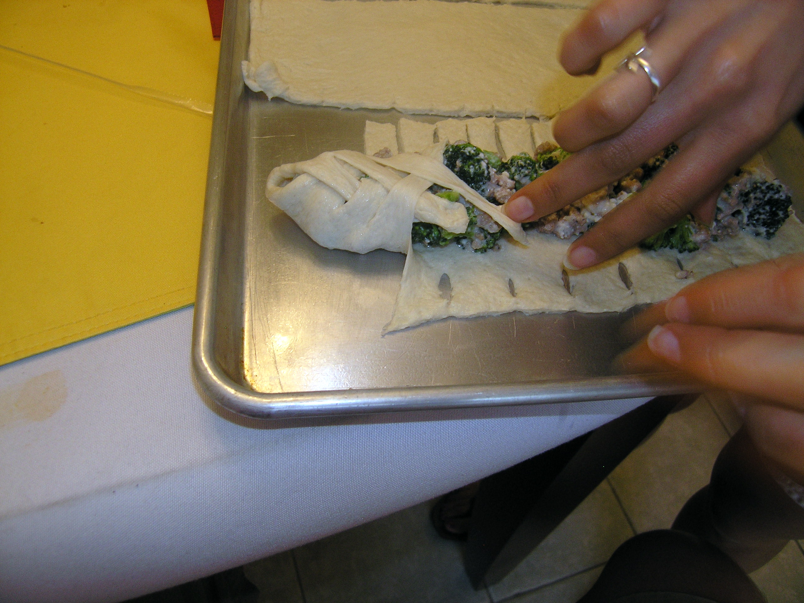 - “Braid” the calzones by criss-crossing the dough back and forth one slit at a time at a downward angle. Try to keep the ends from curling by pulling at the dough. When you reach the bottom few slits, start to fold the dough at an upward angle to create a nice end (pictured). Repeat for each calzone.