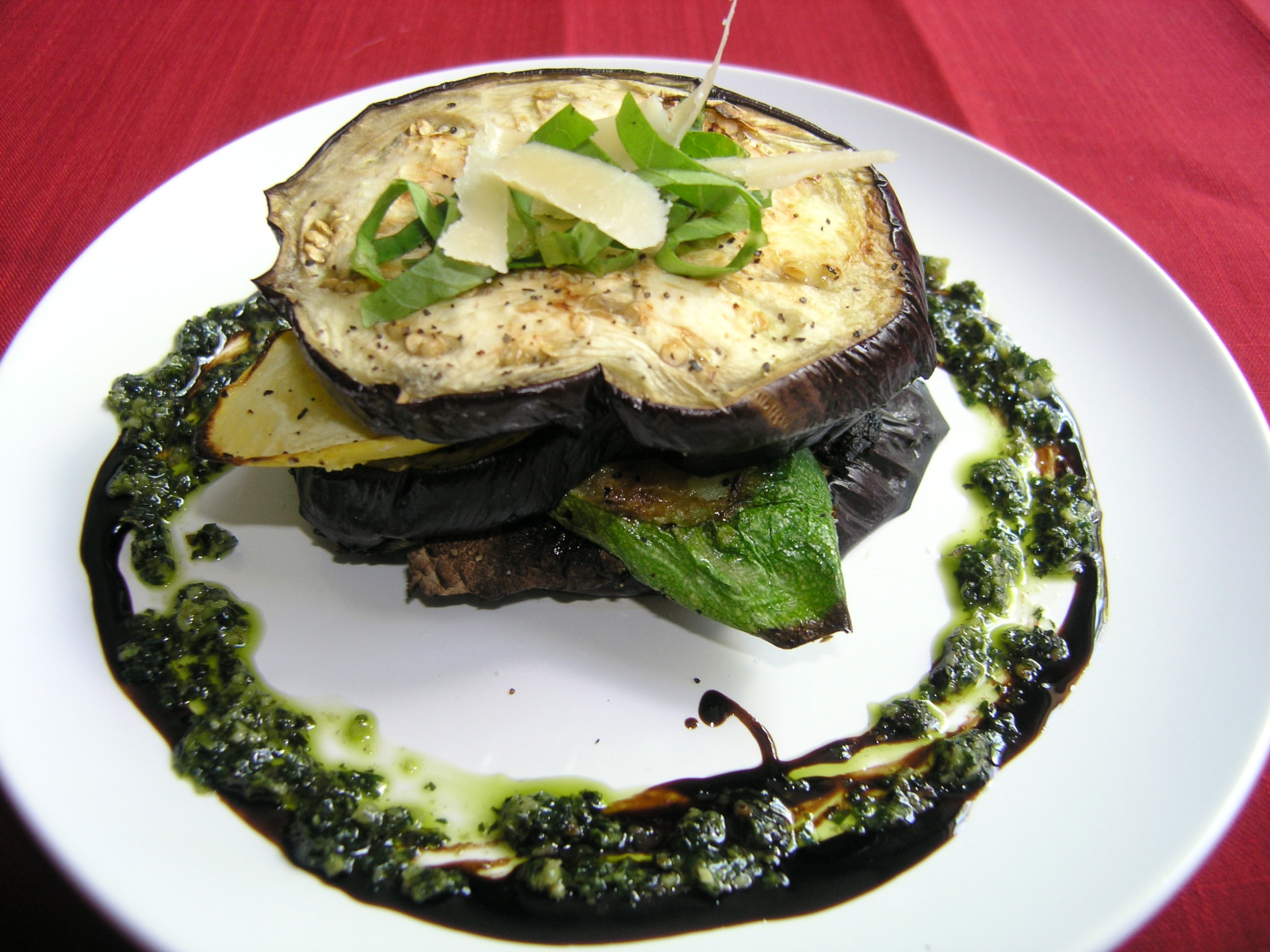 • To assemble: layer one piece of eggplant, the mushroom, eggplant, zucchini, squash, and eggplant on each of 4 plates in that order. Garnish the eggplant with the Parmesan cheese and fresh basil.