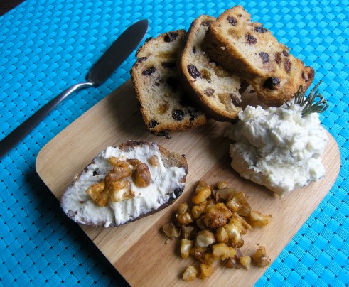 My favorite part of culinary school is when our teachers would say, “no recipes, make what tastes good”. A free for all in the kitchen to create new flavor profiles and expand your palate. One of the basics for making a great dish of any kind is variety in texture, temperature, and taste. This Goat Cheese and Walnut Crostini was one of my first successful attempts at combining a variety of these elements. Warm and sweet raisin crostini are complemented by tangy goat cheese which is infused with orange zest and rosemary. Spicy and crunch are added to the mix with the addition of walnuts that are candied in paprika and cayenne pepper. The mix is unusual but palate pleasing. Just a little goes a long way and will have your guests begging for more.