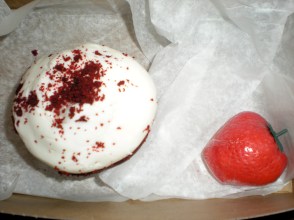 You never know how long it’s going to last, so we decided to celebrate his hard work with a little date to Mike’s Pastry after the game last night. (Don’t forget people, this blog is an entree of food and a side dish of baseball). Mike’s Pastry is a renowned bakery in the North End (the Italian section) that is crammed pack with sweet tooth lovers seeking a variety of baked goods. The cannolis are incredible, the cupcakes weigh about 2 lbs each, and the cookies are delectable. We decided to go with a red velvet cupcake and a marzipan strawberry. If you’ve never had marzipan, it’s sweetened almond paste that is morphed into shapes like little fruits and animals. I wouldn’t eat it just anywhere, because it’s done so well at Mikes’ that I’d have a hard time eating it at a less authentic pastry shop. As we did our little pastry cheers outside, someone walked up to us and said “Mike’s Pastry?! You need to go to Modern Pastry. That’s the best.”
