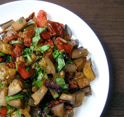 Eggplant Salad with Roasted Red Peppers, Sun Dried Tomatoes, and Basil
