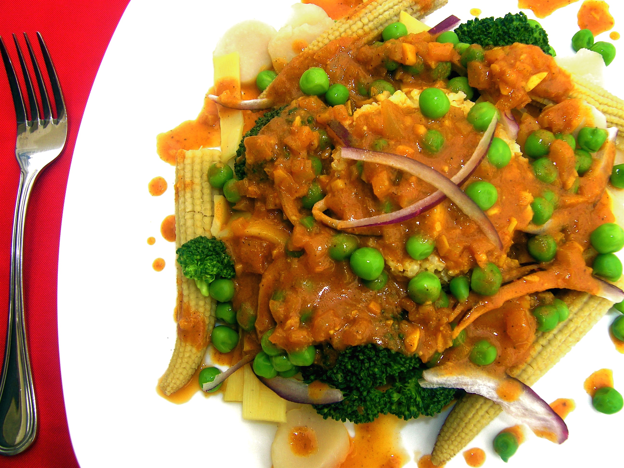 * Note: if you do not have the remaining ingredients available for the curry, you can buy red curry paste in most grocery stores. Substitute 4 tbs red curry paste for the ingredients tomato paste – fresh ginger. Add the curry paste to the fresh vegetables and cook the same way in the recipe.