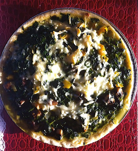 - To make the quiche, heat a large skillet on medium heat. Add the butter, onion, garlic, and shallot to the pan. Saute for 2-3 minutes, or until everything starts to caramelize. Add the mushrooms, spinach, and bell pepper to the pan. Saute for 6-8 minutes, or until all the moisture from the mushrooms and spinach is released and evaporated. Remove from the heat, season with the nutmeg, salt and pepper, and set aside.