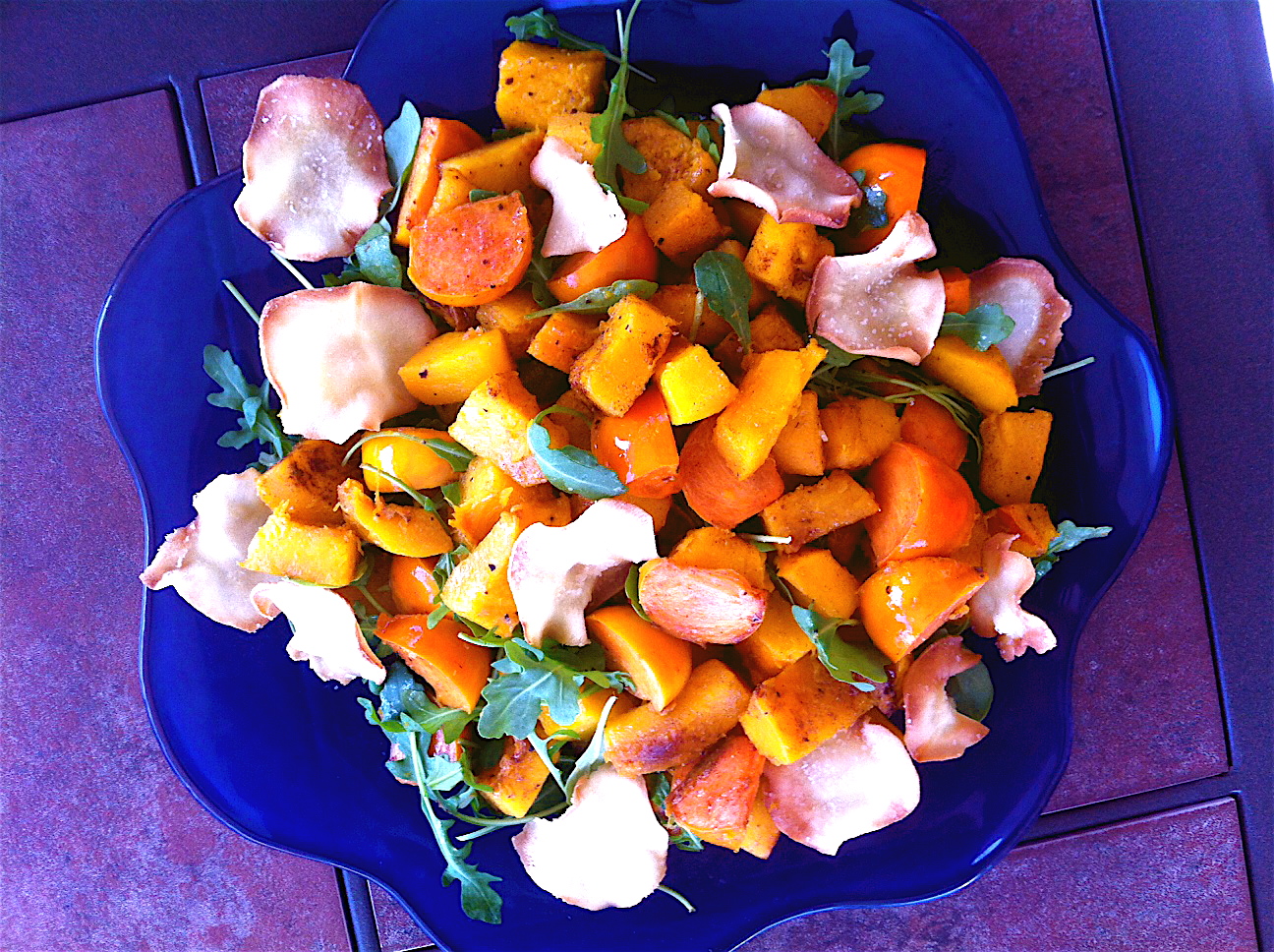 Thanksgiving is the time for hearty and rich side dishes like mashed potatoes and that sweet potato thing with mountains of brown sugar and marshmallow. If you are looking to mix a little something healthy in under the radar, this might be your ticket. I’ve combined some of fall’s favorite squashes and vegetables with sweet persimmons for the perfect starchy side dish. What’s a persimmons? Persimmons are a small orange fruit. They have a thick outer skin that tastes the best when cooked down a little bit. It’s a fruit with a starchy texture but sweet taste. They pair well with nearly anything, from Roasted Chicken to vanilla ice cream, and one of my favorite ingredients in late fall. Here they complement pumpkin, add a nice sweetness to peppery arugula, and embellish a honey-cider vinaigrette. A relatively painless side dish as the holidays come marching in.