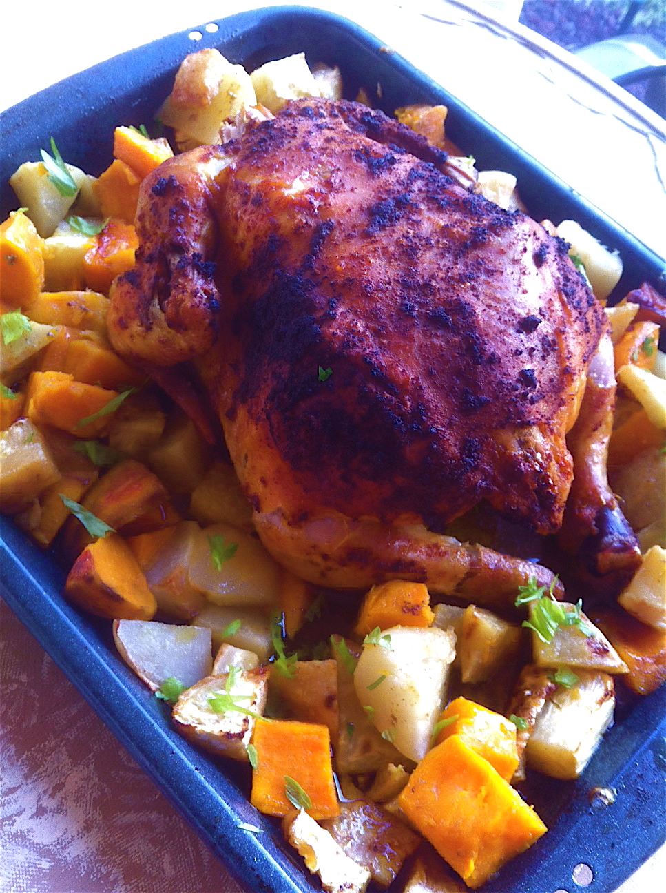 - To make the spice blend, combine all of the listed ingredients (minus salt and pepper) in a small blender. Pulse until blended. Set 1 tbs of the spice blend aside for the vegetables. Use 1/4 of the spice blend to rub inside the cavity, another 1/4 of the blend for under the skin, and the remaining 1/2 for the outside skin of the chicken. Make sure to evenly coat as best as you can. Tie the legs together with butcher’s string. Prick the 2 whole lemons and 6 garlic cloves with a fork and put them in the cavity. Bake the chicken for 45 minutes.